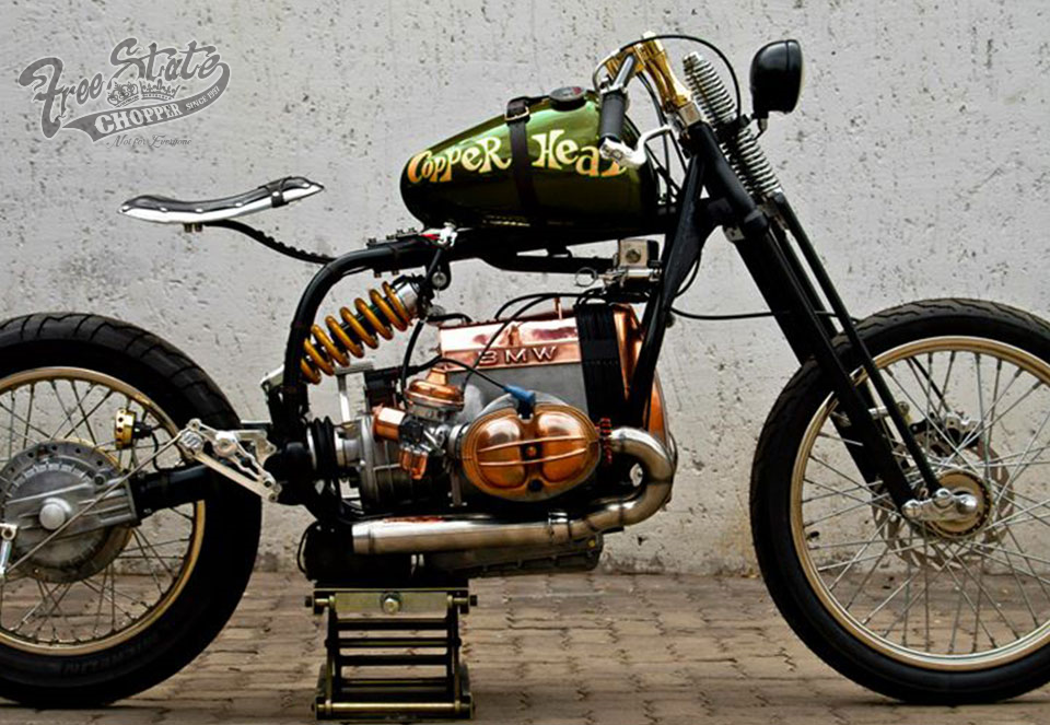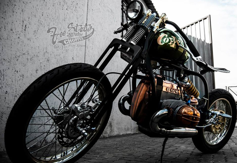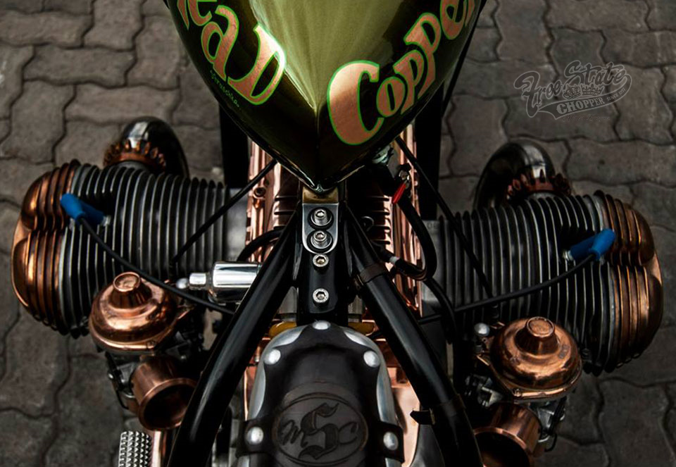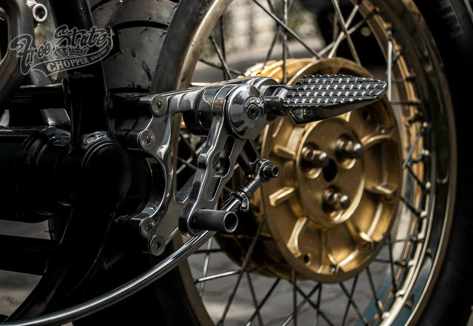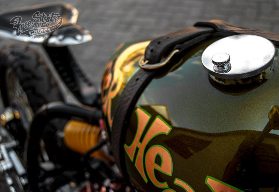 There is loads of eye candy to feast on and the best is we did this all in-house. Wayne fabricated the Aluminum gas tank and the sprung seat. Veruschka did all the copper leaf and old-school pinstriping by hand, and Wayne finished it off with a few layers of gloss clear coat. The rider footrests are also billet-milled aluminum. The Copper Dog bones are one of a kind, milled from solid brass. He also fabricated a custom exhaust that would suit a motorcycle of the era. The Springer front end added that extra Board track racer look.